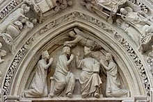 Het timpaan boven de ingang geeft in het onderste gedeelte scènes uit Jezus zijn jeugd te zien, o.a. de vlucht naar Egypte.