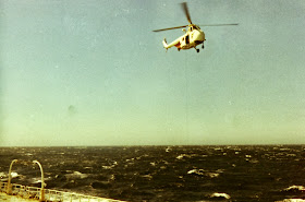 Ver buiten de kust van Zuid-Afrika nadert als een klein stipje de helikopter. Het schip zou dan zoveel mogelijk bijdraaien om te voorkomen dat er golven overdek zouden spoelen.